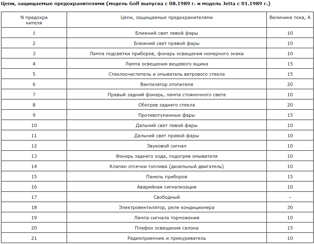 Некоторые электрические цепи не имеют в своем составе предохранителей. Их функцию выполняют тепловые реле, способные автоматически включиться после устранения перегрузки. Точную схему и распиновку предохранителей в Гольф 2 можно посмотреть ниже.
