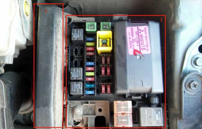 - Схема основного блока предохранителей и реле в моторном отсеке Митсубиси Аутлендер 1