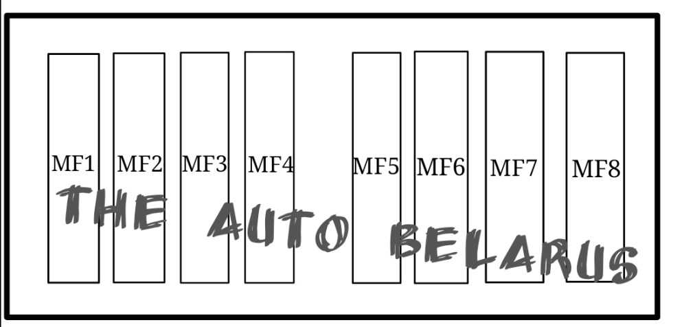 MF1 (50A) MF2 (60A) — Электронный блок управления ABS MF3 (30A) — Электронный блок управления ABS MF4 (60A) MF5 (70A) MF6 (30A) MF7 (40A) — Замок зажигания MF8 (50A) — Электродвигатель вентилятора кондиционера/отопителя