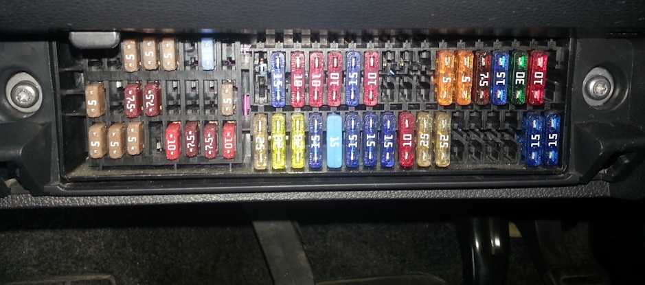 Предохранители в салоне Skoda Octavia A5 находятся под крышкой в левой части передней панели. Открыть крышку можно с помощью отвертки, которая вставляется в специальный паз.