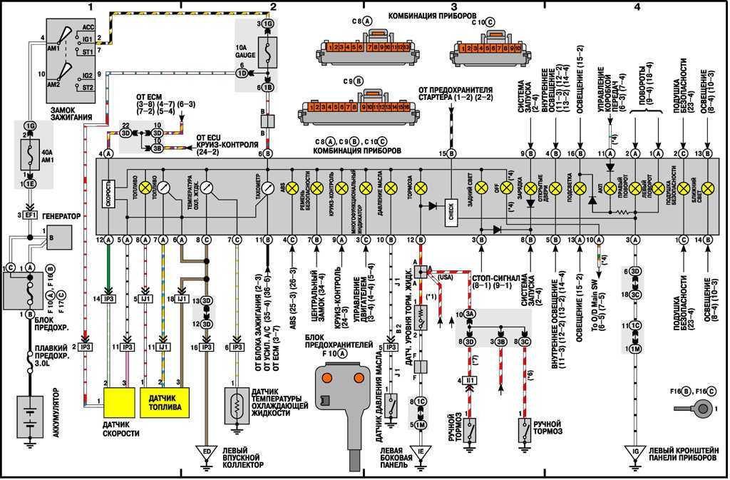 Для подключения приборной панели необходимо знать расположение проводов и их точное назначение. Электропроводка может отличаться из-за разных стран-производителей, но базовые датчики подключаются на свои штатные места.