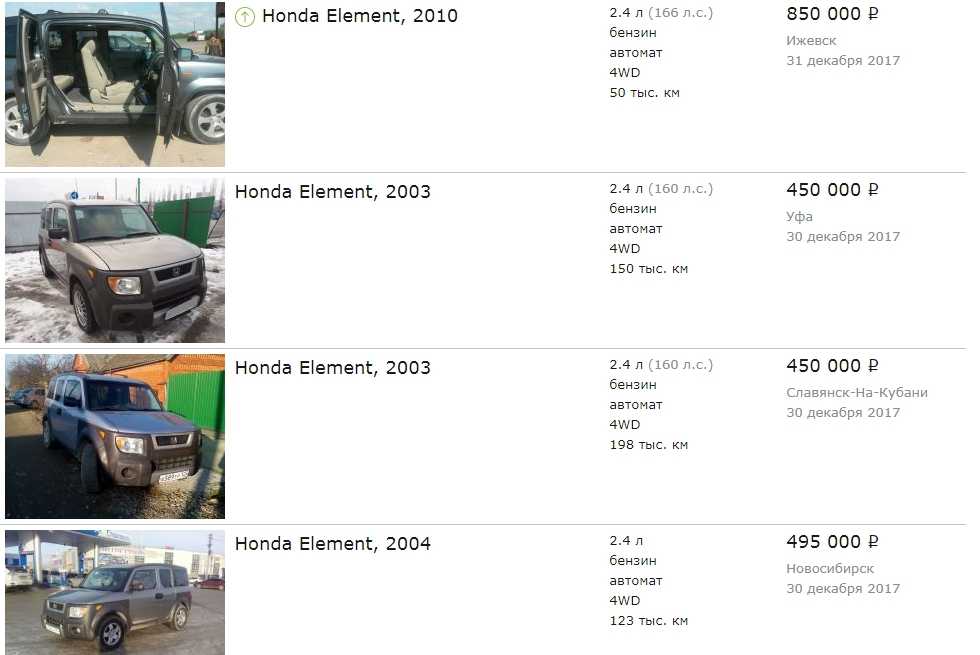 Официальных поставок Хонда Элемент в Россию концерн не осуществлял, модель продавалась в Японии, США и в Канаде. Однако на отечественном вторичном рынке единиц «экспериментальной техники» оказалось не мало (судя по количеству объявлений о продаже данного кроссовера). Чем эта модель приглянулась нашим соотечественникам?