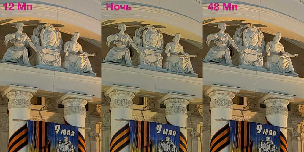 Ночью дела у камер идут весьма недурственно. Пиксели рядом объединяются в один крупный по 1,6 мкм, а разрешение становится 12-мегапиксельным. В таком режиме девайс снимает на автомате и в ночном режиме. Впрочем, нативная резолюция на 48 Мп всё равно вытаскивает больше деталей из кадра. Глядите, как это выглядит.
